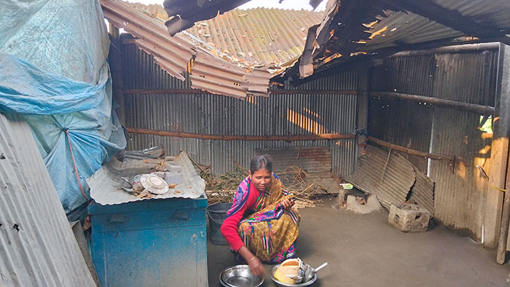 ভাঙ্গাচোরা বেড়ার ঘরে চল্লিশর্ধো ছবিতা বালা ও এক মেয়ের সংসার। পলিথিনের বেড়া আর উপরে ফুটো টিন ছাউনির ঘর।সাপ, ব্যাঙ আর কেঁচোর সাথে নিত্য যুদ্ধ। গ্রামের অনেকেই সরকারী ভাবে বাড়িঘর পেয়েছেন।