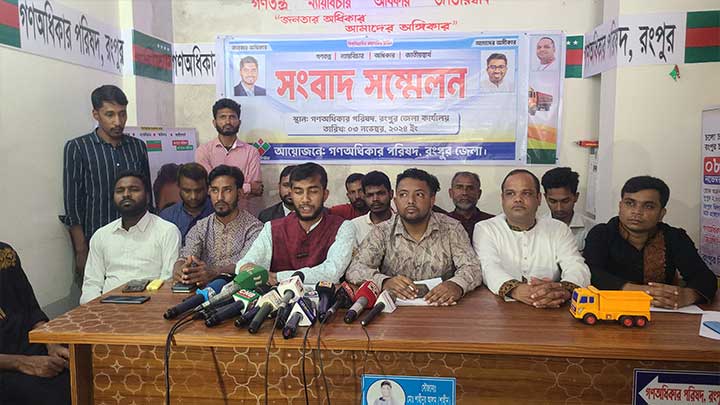 রবিবার (৩ নভেম্বর) দুপুরে নগরীর সিটি পার্ক মার্কেটস্থ গণ অধিকার পরিষদের দলীয় কার্যালয়ে এক সংবাদ সম্মেলনে এসব জানানো হয়।সংবাদ সম্মেলনে বক্তব্য রাখেন, গণ অধিকার পরিষদের কেন্দ্রীয় উচ্চতর পরিষদের সদস্য হানিফ খান সজিব,বিভাগীয় সাংগাঠনিক সম্পাদক মাসুদ রানা মন্নাফ। এসময় উপস্থিত ছিলেন, জেলা শাখার ভারপ্রাপ্ত আহ্বায়ক শেরে খোদা আব্দুল্লাহ সহ অন্যরা।