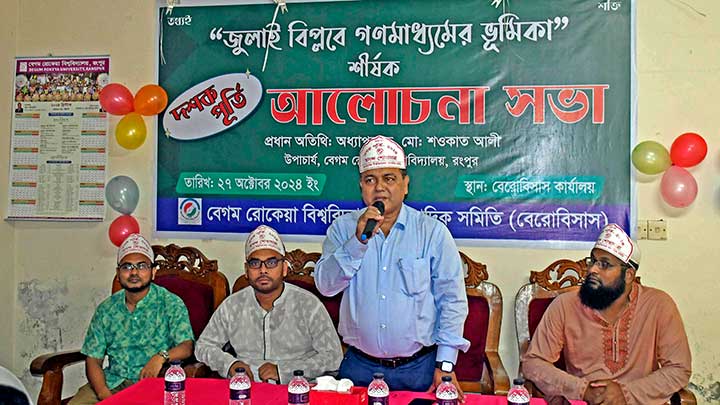 রবিবার (২৭শে অক্টোবর) দুপুরে বেগম রোকেয়া বিশ্ববিদ্যালয়ের সাংবাদিক সমিতির এক দশক পূর্তি উপলক্ষ্যে ‘জুলাই বিপ্লবে গণমাধ্যমের ভূমিকা’ শীর্ষক এক আলোচনা সভায় প্রধান অতিথির বক্তৃতায় বেগম রোকেয়া বিশ্ববিদ্যালয়ের উপাচার্য মোঃ শওকাত আলী এসব কথা বলেন।