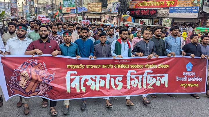 গণভোটের রায় বাস্তবায়নে সরকারের টালবাহানার প্রতিবাদে রংপুরে বিক্ষোভ মিছিল করেছে মহানগর ছাত্র শিবির।