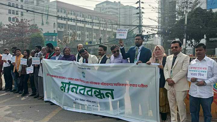 গাজায গণহত্যা বন্ধ এবং সাংবাদিক নির্যাতন বন্ধের দাবিতে রংপুরে মানববন্ধন ও প্রতিবাদ সমাবেশ করেছে গণমাধ্যমকর্মীরা।