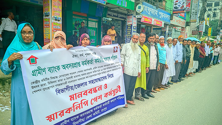 অবসরপ্রাপ্ত গ্রামীণ ব্যাংক কর্মকর্তা-কর্মচারীদের বিভিন্ন দাবি বাস্তবায়নের দাবিতে রংপুরে মানববন্ধন কর্মসূচি পালন করা হয়েছে। পরে জেলা প্রশাসকের মাধ্যমে প্রধান উ