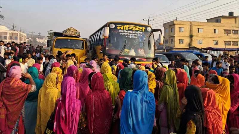 রাবেয়া আক্তার নামে আরেক শ্রমিক বলেন, গত এপ্রিল মাস থেকে কারখানা বন্ধ ছিল। সেপ্টেম্বর মাসে কারখানা খুললেও দুই মাসের বেতন না দিয়ে কর্তৃপক্ষ বিভিন্ন তালবাহানা করছে। পুলিশ ও সেনাবাহিনীর মাধ্যমে বারবার বেতন পরিষদের তারিখ দিলেও কারখানা কর্তৃপক্ষ শ্রমিকদের বেতন দিচ্ছে না। তাই বাধ্য হয়ে সড়ক অবরোধ করতে হয়েছে।