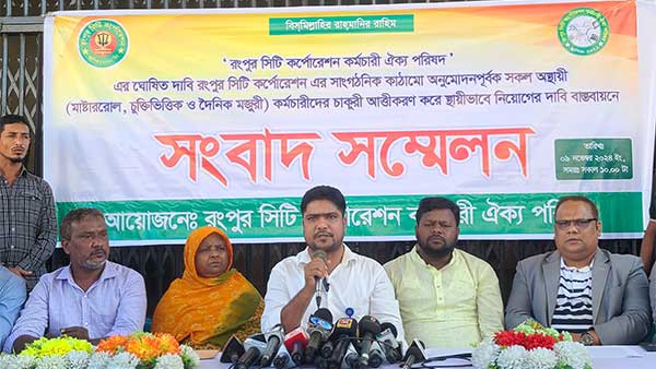 শনিবার বেলা ১১টায় সংবাদ সম্মেলনে লিখিত বক্তব্য পড়ে শোনান বেলাল।তিনি বলেন ২০১২ সালের ২৮ জুন রংপুর পৌরসভা থেকে সিটি কর্পোরেশনে উন্নিত হয়। যার আয়তন বাংলাদেশের ২য় বৃহত্তম সিটি ২০৫.৭০ বর্গ কিঃমিঃ।জনসংখ্যা প্রায় ১০ লাখ।সিটি কর্পোরেশন প্রতিষ্ঠিত হওয়ার পরপরই সাংগঠনিক কাঠামোতে ৫০৭ টি পদ সৃজনের প্রস্তাব স্থানীয় সরকার পল্লী উন্নয়ন ও সমবায় মন্ত্রণালয়ে পাঠানো হয়।দীর্ঘসূত্রিতা এবং অনুমোদন প্রক্রিয়ায় জটিলতা ও কালক্ষেপন করে ১২ বছরেও রংপুর সিটি কর্পোরেশনের সাংগঠনিক কাঠামো অদ্যাবধি অনুমোদন দেয়া হয়নি অথচ অন্যান্য সিটি কর্পোরেশন রংপুর এর পরে স্থাপিত হয়েও তাদের সাংগঠনিক কাঠামো অনুমোদন দেয়া হয়েছে। বিগত সরকারের আমলে রংপুর সিটি কর্পোরেশন সবচেয়ে বেশি বৈষম্যেও শিকার হয়েছে । বাজেট বৈষম্যসহ অন্যান্য প্রশাসনিক উন্নীতকরন সকল কার্যক্রমে অনেক পিছিয়ে পড়েছে। অধুনালুপ্ত রংপুর পৌরসভার অতি অল্প সংখ্যক জনবল এবং মাস্টাররোল, চুক্তিভিত্তিক ও দৈনিক হাজিরা ভিত্তিক কর্মচারী দ্বারা দীর্ঘ ১২ বছর ধরে সিটি কর্পোরেশনের কর্মকান্ড পরিচালিত হচ্ছে।আমরা অনেকেই কমপক্ষে ৫-১৫ বছর ধরে অস্থায়ী (মাস্টাররোল, চুক্তিভিত্তিক ও দৈনিক মজুরী) হিসাবে কর্মরত আছি। যেখানে বাংলাদেশের সংবিধানের ১৫ নং অনুচ্ছেদে নাগরিকদের যুক্তিসংগত মজুরীর বিনিময়ে কর্মসংস্থান নিশ্চয়তার বিষয়টি রাষ্ট্রের অন্যতম মৌলিক দায়িত্ব হিসেবে বলা হয়েছে সেখানে আমাদেরকে অত্যান্ত কম বেতন ৩৫০-৪৫০ মাত্র টাকা দৈনিক মজুরী প্রদান করা হয়ে থাকে। অথচ আমরাই সিটি কর্পোরেশনের সমুদয় রাজস্ব আহরণ থেকে শুরু করে কর্পোরেশনের প্রত্যেক বিভাগ/শাখায় প্রায় সকল দাপ্তরিক গুরুত্বপূর্ণ কাজই করে থাকি। একজন (মাষ্টার্স/সমমান) কর্মচারীর পরিবারে ৬ জন সদস্য বিবেচনায় আমাদের মাসিক বেতন/মজুরী (শুক্র, শনি এবং সরকারি কোন গেজেটেড ছুটিতে মজুরী প্রদান করা হয়না ৮ হাজার থেকে ১২ হাজার টাকায় ৩ বেলা খাবার, মাথা গোজার ঠাঁই, চিকিৎসা, সন্তানের শিক্ষা ইত্যাদি ব্যয় মিটিয়ে মানবিক, সামাজিক ও অর্থনৈতিক মর্যাদা নিয়ে জীবনধারণ করা দুর্বিসহ হয়ে উঠেছে। আমরা রংপুর সিটি কর্পোরেশনের অস্থায়ী কর্মচারীরা চরম বৈষম্য ও প্রহসনের শিকার। আমরা আপনার নিকট অত্যন্ত কৃতজ্ঞ যে, একটি নতুন রাষ্ট্র ব্যবস্থার যুগ-সন্ধিক্ষণে বৈষম্যহীন সমাজ নির্মাণে ন্যায়বিচার প্রতিষ্ঠা, অধিকারের সুরক্ষা ও সুবিচার সুপ্রতিষ্ঠার জন্য আপনি অক্লান্ত চেষ্টা ও পরিশ্রম করে যাচ্ছেন। এমতাবস্থায়, আপনার সানুগ্রহ সহানুভূতি ও মানবিক মহানুভবতায় বিবেচনা করে রংপুর সিটি কর্পোরেশনের সাংগঠনিক কাঠামো অবিলম্বে অনুমোদন পূর্বক ঐক্য পরিষদের আওতাধীন সকল অস্থায়ী কর্মচা
