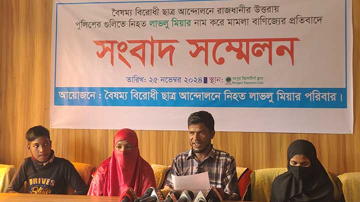 সোমবার(২৫ নভেম্বর) দুপুরে রংপুর রিপোর্টার্স ক্লাব মিলনায়তনে এক সংবাদ সম্মেলনে এই দাবি করেন শহীদ লাবলু মিয়ার ছোট ভাই ডালু মিয়া।