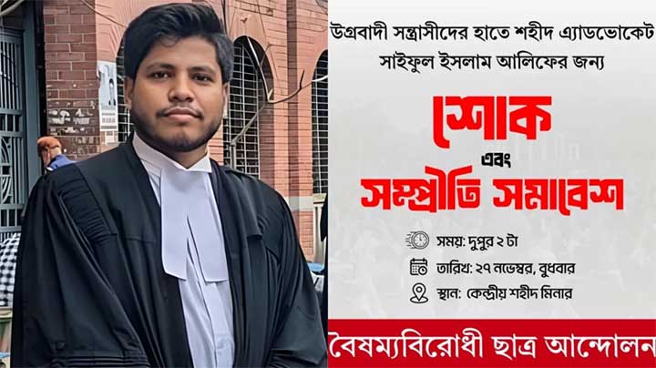 চট্টগ্রামের তরুণ অ্যাডভোকেট সাইফুল ইসলাম আলিফকে হত্যার ‘শোককে সম্প্রীতির শক্তিতে বলিয়ান’ করতে ঢাকায় কর্মসূচি ঘোষণা করেছে বৈষম্যবিরোধী ছাত্র আন্দোলন।