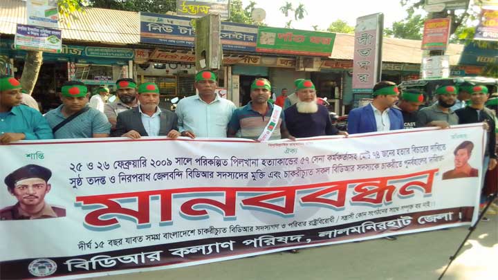 লালমনিরহাটে "শান্তি, ঐক্য, অধিকার" স্লোগানে ২০০৯ সালের ২৫ ও ২৬ ফেব্রুয়ারি পিলখানা হত্যাকাণ্ডের সুষ্ঠু তদন্ত, নিরপরাধ জেলবন্দি বিডিআর সদস্যদের মুক্তি, এবং চাকরিচ্যুত সকল বিডিআর সদস্যকে পুনর্বহালের দাবিতে মানববন্ধন অনুষ্ঠিত হয়েছে।