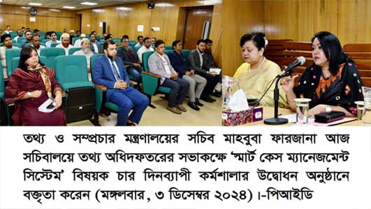 তথ্য ও সম্প্রচার মন্ত্রণালয়ের উদ্যোগে 'স্মার্ট কেস ম্যানেজমেন্ট সিস্টেম' বিষয়ক চার দিনব্যাপী কর্মশালা শুরু হয়েছে। মঙ্গলবার (৩রা ডিসেম্বর) তথ্য অধিদফতরের সভাকক্ষে কর্মশালার উদ্বোধন করেন তথ্য ও সম্প্রচার মন্ত্রণালয়ের সচিব মাহবুবা ফারজানা।