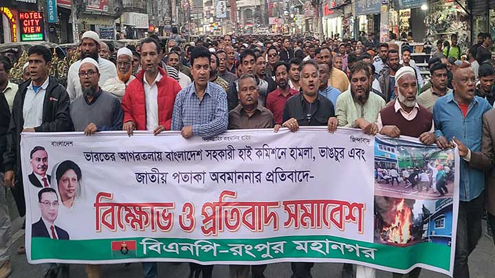 ভারতের আগরতলায় বাংলাদেশর সহকারী হাই কমিশনে হামলার প্রতিবাদে বিক্ষোভ মিছিল ও প্রতিবাদ সমাবেশ করেছে রংপুর মহানগর বিএনপি।মঙ্গলবার(৩ ডিসেম্বর)বিকেলে নগরীর গ্রান্ড হোটেল মোড়স্থ দলীয় কার্যালয় থেকে বিক্ষোভ মিছিল বের হয়ে নগরীর প্রধান সড়ক প্রদক্ষিণ করে। বিক্ষোভ মিছিলে ‘দিল্লী না ঢাকা, ঢাকা ঢাকা’, ছি’ছি হাসিনা, লজ্জায় বাঁচি না, “মোদি বলে হাসিনা বলো, কেউ রবে নারে, সব শালারা ভাইসা যাবে বঙ্গোপসাগরে, কাদের বলো, ইনু বলো, কেউ রবে নারে, সব শালারা ভাইসা যাবে বঙ্গোপসাগরে” ইত্যাদি স্লোগান দেয়া হয়।