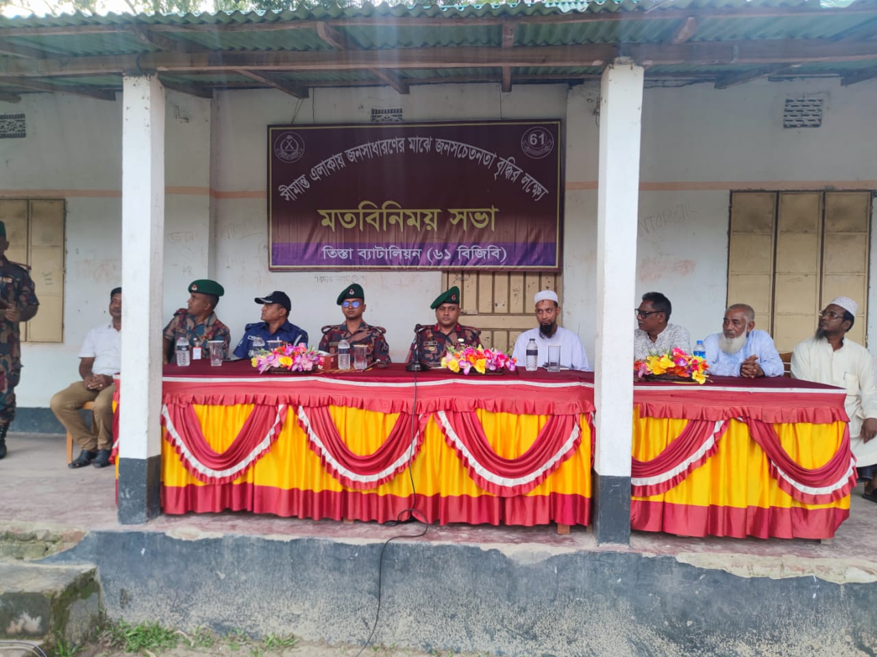 গতকাল রবিবার বিকালে ৬১ বিজিবি এর অধিনায়ক লেঃ কর্ণেল শেখ মোহাম্মদ মুসাহিদ মাসুম, পিএসসি'র সভাপতিত্বে মতবিনিময় সভায় হাতিবান্ধা উপজেলা নির্বাহী কর্মকর্তা আতিকুল ইসলাম, হাতিবান্ধা থানা ভারপ্রাপ্ত কর্মকর্তা মাহামুদুন নবী ও লালমনিরহাটের বিভিন্ন ধর্মীয় প্রতিনিধিগণ এবং স্থানীয় জনপ্রতিনিধিগন উপস্থিত ছিলেন।