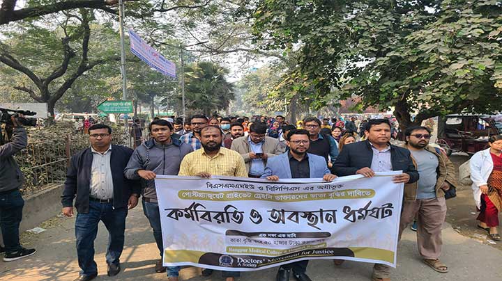রংপুর মেডিকেল হাসপাতালে বঙ্গবন্ধু শেখ মুজিব মেডিকেল বিশ্ববিদ্যালয় (বিএসএমএমইউ) ও বাংলাদেশ কলেজ অব ফিজিশিয়ানস অ্যান্ড সার্জনসের (বিসিপিএস) অধিভুক্ত পোস্ট গ্র্যাজুয়েট প্রাইভেট ট্রেইনি চিকিৎসকেরা ভাতা বাড়ানোর দাবিতে বিক্ষোভ মিছিল কর্মবিরতি ও অবস্থান ধর্মঘট করেছেন। তাঁদের দাবি মানা না হলে কর্মবিরতি ও অবস্থান ধর্মঘট অব্যাহত থাকবে বলে আন্দোলন কারীরা জানান।