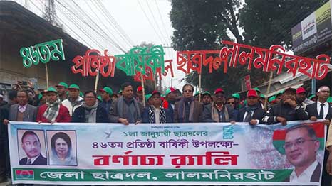 বর্ণাঢ্য আয়োজনে লালমনিরহাটে ছাত্রদলের ৪৬তম প্রতিষ্ঠা বার্ষিকী উদযাপন হয়েছে। ইংরেজি নতুন বছরকে স্বাগত জানিয়ে প্রতিষ্ঠা বার্ষিকী উপলক্ষে র্যালী ও দিনব্যাপী সেচ্ছায় রক্তদান কর্মসূচি পালন করেন লালমনিরহাট জেলা ছাত্রদল।