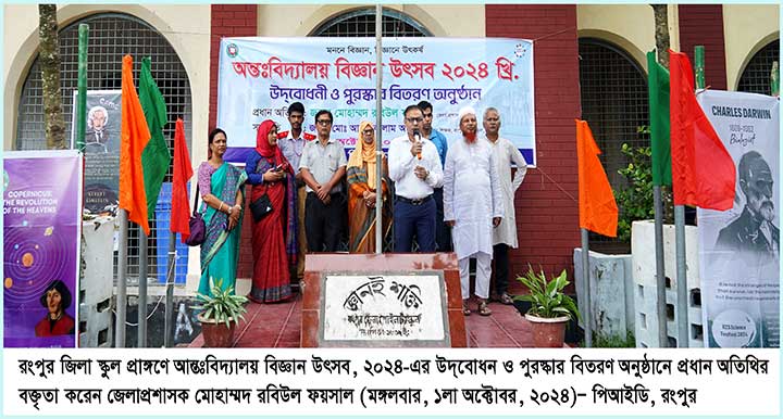 রংপুরে আন্তঃবিদ্যালয় বিজ্ঞান উৎসব ২০২৪ অনুষ্ঠিত হয়েছে। মঙ্গলবার (১লা অক্টোবর) রংপুর জিলা স্কুল মাঠে আন্তঃবিদ্যালয় বিজ্ঞান উৎসব ২০২৪-এর উদ্বোধন অনুষ্ঠানে প্রধান অতিথি হিসাবে উপস্থিত ছিলেন রংপুরের জেলাপ্রশাসক মোহাম্মদ রবিউল ফয়সাল।