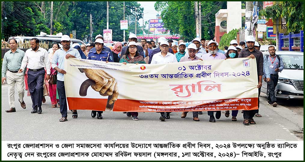 ‘মর্যাদাপূর্ণ বার্ধক্য: বিশ্বব্যাপী প্রবীণ পরিচর্যা ও সহায়তা ব্যবস্থা শক্তিশালীকরণ’ এই প্রতিপাদ্যে রংপুরে ৩৪তম আন্তর্জাতিক প্রবীণ দিবস ২০২৪ উদ্যাপিত হয়েছে। দিবসটি উপলক্ষ্যে সকালে রংপুর জেলাপ্রশাসকের সম্মেলনকক্ষে অনুষ্ঠিত আলোচনাসভায় প্রধান অতিথি হিসাবে উপস্থিত ছিলেন জেলাপ্রশাসক মোহাম্মদ রবিউল ফয়সাল। রংপুর জেলাপ্রশাসন ও জেলা সমাজসেবা কার্যালয় যৌথভাবে এই আলোচনাসভার আয়োজন করে।