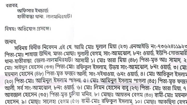 এ ঘটনায় ভুক্তভোগী শাহাজ উদ্দিনের ছেলে দুলাল মিয়া বাদী হয়ে ১৩ জনের নাম উল্লেখ করে হাতীবান্ধা থানায় একটি লিখিত অভিযোগ দায়ের করেন।