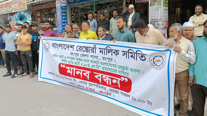 সম্পূরক শুল্ক প্রত্যাহার ও ভ্যাট বৃদ্ধির প্রতিবাদে আয়োজিত মানববন্ধনে বাংলাদেশ রেস্তোরাঁ মালিক সমিতি রংপুর জেলা শাখার সভাপতি নুরুল হক মুন্নার সভাপতিত্বে বক্তব্য রাখেন সাধারণ সম্পাদক শহিদ আক্তার সোহেল, যুগ্ন সম্পাদক আব্দুল খালেক, দোকান মালিক সমিতির যুগ্ন সম্পাদক আলমগির হোসেন, বাংলাদেশ রেস্তোরাঁ মালিক সমিতি রংপুর জেলা শাখার প্রচার সম্পাদক নুরুন্নবী লাকু, কোষাধ্যক্ষ হেলাল হোসেন প্রমূখ।