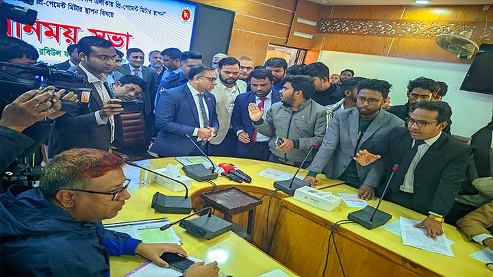 প্রসঙ্গত,গত ১৩ জানুয়ারী সোমবার দুপুরে জেলা প্রশাসকের কার্যালয়ে ‘সরকারি অর্থায়নে রাজশাহী ও রংপুর বিভাগে নেসকোর আওতাধীন এলাকায় প্রি-পেমেন্ট মিটার স্থাপন’ শীর্ষক প্রকল্পের আওতায় প্রি-পেমেন্ট মিটার স্থাপন বিষয়ে মতবিনিময় সভা হয়।এতে প্রিপেইড মিটার স্থাপন নিয়ে আন্দোলনকারী সংগঠনের নেতারা, বৈষম্যবিরোধী ছাত্র আন্দোলন ও স্থানীয় নাগরিক সমাজের প্রতিনিধিদের আমন্ত্রন করা হয়। সভায় সভাপতিত্ব করেন জেলা প্রশাসক মোহাম্মদ রবিউল ফয়সাল।সভার শুরুতে প্রিপেইড মিটারের সুযোগ-সুবিধা বোঝাতে প্রজেক্টরের মাধ্যমে প্রেজেন্টেশন উপস্থাপন করেন রাজশাহী ও রংপুর বিভাগে নেসকোর আওতাধীন এলাকায় স্মার্ট প্রিপেমেন্ট মিটার স্থাপন প্রকল্প বিভাগ-১ এর ভারপ্রাপ্ত নির্বাহী প্রকৌশলী সাইয়্যিদুল মুরসালীন।এসময় স্ক্রিনে ভেসে ওঠা একটি স্লাইডে মুজিববর্ষের লোগো দেখা গেলে সভায় অংশ গ্রহণকারী বৈষম্যবিরোধী ছাত্র আন্দোলনের নেতা ও অন্যরা প্রতিবাদ করেন। একপর্যায়ে হট্টগোল শুরু হলে সভা স্থগিত করেন জেলা প্রশাসক। এসময় নেসকোর প্রধান প্রকৌশলী আশরাফুল ইসলাম মন্ডলসহ অন্য কর্মকর্তারা উপস্থিত ছিলেন।