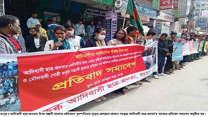 আদিবাসী ছাত্র-জনতার উপর সন্ত্রাসী হামলার প্রতিবাদে রংপুরে প্রতিবাদ সমাবেশ হয়েছে। বৃহস্পতিবার (১৬ জানুয়ারী) দুপুরে প্রেসক্লাব প্রাঙ্গনে সংক্ষুব্ধ আদিবাসী ছাত্র-জনতা’র ব্যানারে কর্মসূচীতে বক্তব্য রাখেন, বেগম রোকেয়া বিশ্ববিদ্যালয়ের শিক্ষার্থী নরডিক মারান্ডি, বেগম রোকেয়া বিশ্ববিদ্যালয়ের ইন্ডিজেনাস স্টুডেন্ট অ্যাসোসিয়েশনের অর্থ সম্পাদক অং মারমা, সাংগঠনিক সম্পাদক মথি ত্রিপুরা, এনাম রেমা, মং মারমা, লিজা চাকমা, রিনা মুরমুসহ অন্যরা।