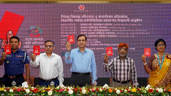 রংপুরে শিশুর বিরুদ্ধে সহিংসতা ও বাল্যবিবাহ প্রতিরোধে বিভাগীয় পর্যায়ে মাল্টিমিডিয়া প্রচার কার্যের উদ্বোধন করা হয়েছে। সোমবার (৭ অক্টোবর) সকালে রংপুর বিভাগীয় কমিশনারের সভাকক্ষে প্রধান অতিথি হিসাবে উপস্থিত থেকে এই প্রচারকার্যের উদ্বোধন করেন বিভাগীয় কমিশনার (ভারপ্রাপ্ত) মো. আজমল হোসন।