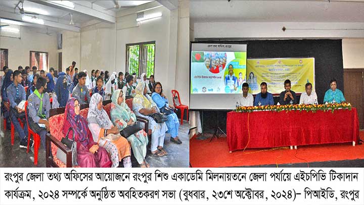 রংপুর জেলা তথ্য অফিসের উদ্যোগে ও ইউনিসেফের সহযোগিতায় জরায়ুমুখ ক্যানসার প্রতিরোধী এইচপিভি টিকাদান কর্মসূচি, ২০২৪ উপলক্ষ্যে অবহিতকরণ সভা অনুষ্ঠিত হয়েছে। বুধবার (২৩শে অক্টোবর) রংপুর জেলা শিশু একাডেমি মিলনায়তনে আয়োজিত এই সভায় রংপুরের ডেপুটি সিভিল সার্জন ডা. রুহুল আমিন প্রধান অতিথি হিসাবে উপস্থিত ছিলেন।