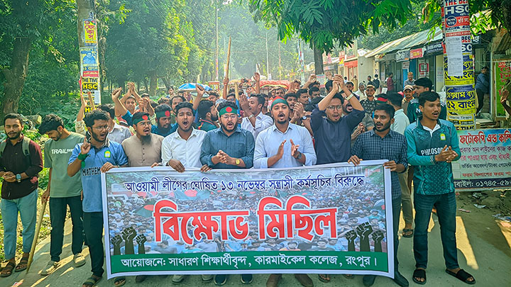 রংপুর কারমাইকেল কলেজের শিক্ষার্থীরা আওয়ামীলীগ ঘোষিত ১৩ নভেম্বর লকডাউনকে ঘিরে সন্ত্রাসী কর্মসূচীর বিরুদ্ধে বিক্ষোভ মিছিল করেছে ।