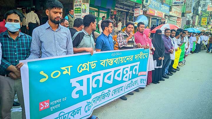 এ সময় বক্তারা বলেন, গত ১৫ বছরধরে স্বাস্থ্যখাতে টেকনোলজিস্ট পদে নিয়োগ নেই। সরকার ডিপ্লোমা নার্স, কৃষিবীদ, ইঞ্জিনিয়ারদের ১১ তম গ্রেড থেকে দশম গ্রেডে উন্নীতকরলেও ডিপ্লোমা টেকনোলজিস্ট ও ফার্মাসিস্টরা চরম অবহেলার শিকার হয়েছে।