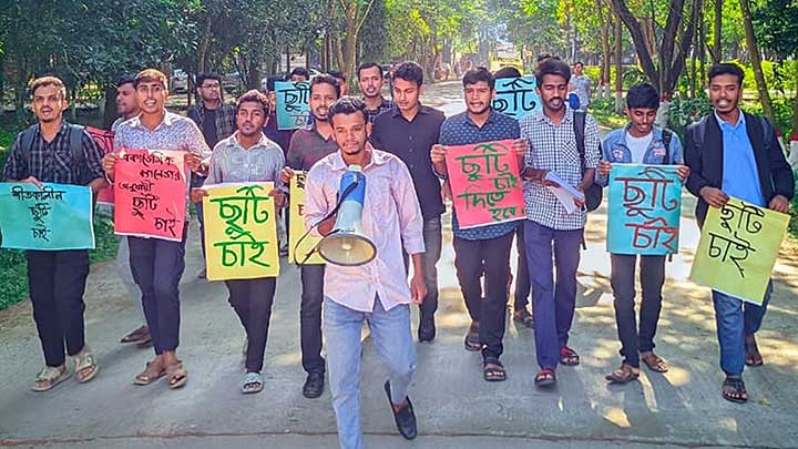 বুধবার (২৬ নভেম্বর) দুপুরে বিশ্ববিদ্যালয়ের মিডিয়া চত্ত্বর থেকে প্লাকার্ড হাতে শিক্ষার্থীরা বিক্ষোভ মিছিল নিয়ে প্রশাসনিক ভবনের সামনে অবস্থান নিয়ে বিক্ষোভ করতে থাকে। শিক্ষার্থী মাসুদ রানা, রুমন মিয়া, স্বাধীন ইসলামসহ অন্যরা জানান, শীতকালীন ছুটি নির্ধারিত সময়ে এবং ব্রাকসু নির্বাচন উৎসব মুখর করতে ছুটি পরবর্তী যৌক্তিক সময়ে সময় নির্ধারনের জন্য সহস্রাধিক শিক্ষার্থী গণস্বাক্ষর করেছে। ব্রাকসু নির্বাচনের জন্য শীতকালীন ছুটি পেছালে প্রাইভেট পড়িয়ে লেখাপড়া করা শিক্ষার্থীরা যথা সময়ে প্রাইভেট পড়ানো শুরু করতে না পেরে উপার্জনের সুযোগ হারাবে। শিক্ষক-কর্মকর্তারাও যথা সময়ে শীতকালীন ছুটি চান বলে জানান শিক্ষার্থীরা।