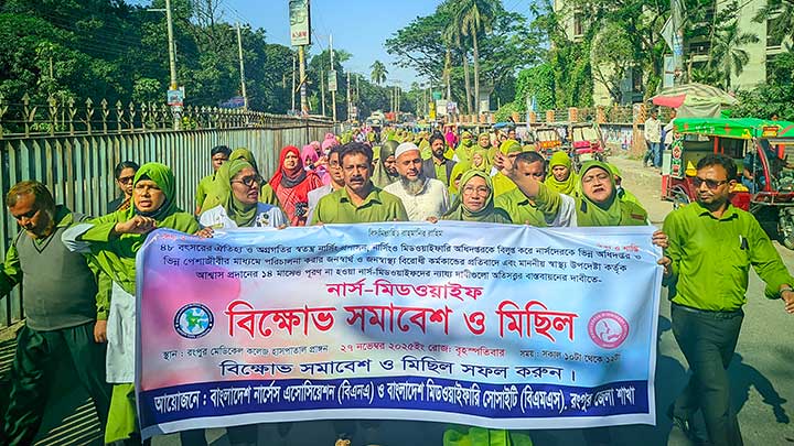 স্বতন্ত্র নার্সিং প্রশাসন, নার্সিং ও মিডওয়াইফারি অধিদপ্তরকে বিলুপ্ত করে অন্য অধিদপ্তরের সাথে একীভূতের প্রস্তাবের প্রতিবাদে রংপুরে বিক্ষোভ মিছিল-সমাবেশ করেছে নার্সেস অ্যাসোসিয়েশন ও মিডওয়াইফারি সোসাইটি।