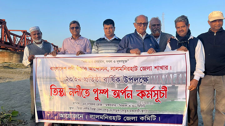 বাংলাদেশ নদী বাঁচাও আন্দোলনের ২০তম প্রতিষ্ঠাবার্ষিকী উপলক্ষে গত ২৫ নভেম্বর বিকালে তিস্তা নদীর তিস্তা রেলসেতু ও সড়কসেতুর মধ্যবর্তী স্থানে তিস্তায় ক্ষীণ স্রোতের মধ্যে পুষ্প অর্পণ করা হয়।