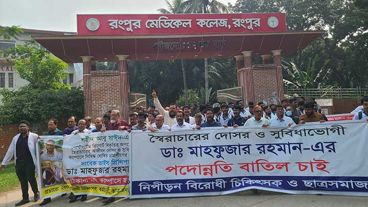 রংপুর মেডিকেল কলেজে নতুন নিয়োগ পাওয়া অধ্যক্ষ মাহফুজার রহমানের অপসারণের দাবিতে বিক্ষোভ সমাবেশ, ক্লাস বর্জন ও তার কক্ষে তালা লাগানোর ঘটনায় উত্তপ্ত হয়ে উঠেছে ক্যাম্পাস।অধ্যক্ষকে অপসারণ করা না হলে শনিবার থেকে একাডেমিক ও প্রশাসনিক কার্যক্রম অনির্দিষ্টকালের জন্য বন্ধ ঘোষণার আলটিমেটাম দেওয়া হয়েছে।