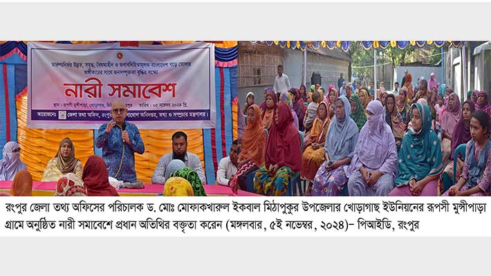 নারীদের জীবনমান উন্নয়নের লক্ষ্যে রংপুর জেলা তথ্য অফিসের উদ্যোগে নারী সমাবেশ অনুষ্ঠিত হয়েছে। মঙ্গলবার (৫ই নভেম্বর) রংপুরের মিঠাপুকুর উপজেলার খোড়াগাছ ইউনিয়নের রুপসী মুন্সীপাড়া গ্রামে অনুষ্ঠিত এই সমাবেশে প্রধান অতিথি হিসাবে উপস্থিত ছিলেন রংপুর জেলা তথ্য অফিসের পরিচালক ড. মো: মোফাকখারুল ইকবাল। অনুষ্ঠানে সভাপতিত্ব করেন রংপুর জেলা তথ্য অফিসের সহকারী পরিচালক আলমগীর কবির।